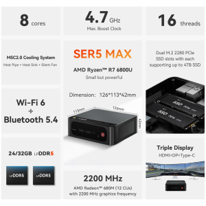 Με ισχυρό επεξεργαστή AMD Ryzen R7 6800U, μνήμη RAM 24GB, 500GB M.2 SSD και προεγκατεστημένο λειτουργικό Windows 11 Pro, το SER5 Max προσφέρει πολύ ομαλή εμπειρία λειτουργίας για να εργαστείτε, να δείτε ταινίες, να παίξετε παιχνίδια ή να περιηγηθείτε στο διαδίκτυο, από το σπίτι ή το γραφείο.