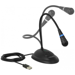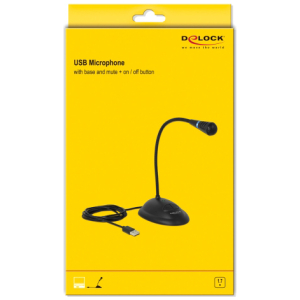Μικρόφωνο USB της Delock με βάση από καουτσούκ του παρέχει προστασία από την ολισθηρότητα και εύκαμπτο βραχίονα που επιτρέπει στο μικρόφωνο να λυγίσει εύκολα προς την επιθυμητή κατεύθυνση. Το LED φωτάκι με την πράσινη ένδειξη LED δείχνει τη λειτουργία του μικρόφωνου και με την μπλε ή κόκκινη ένδειξη την ενεργοποίηση ή απενεργοποίησή της σίγασης αντίστοιχα. Διαθέτει ένα πλήκτρο σίγασης και ένα πλήκτρο ενεργοποίησης και απενεργοποίησης του μικροφώνου.