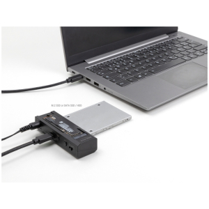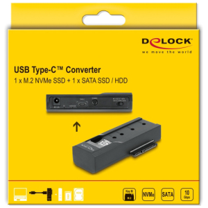 Αυτό το docking station της Delock επιτρέπει την σύνδεση ενός M.2 NVMe/SATA SSD (σε 2280, 2260, 2242 and 2230 format) ή ενός 2.5"/3.5" SSD/HDD σε ένα PC ή laptop μέσω θύρας USB ή USB-C (συμπεριλαμβάνονται καλώδια).