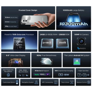 Διαθέτει μεγάλη οθόνη 6.6" HD+, οκταπύρηνο επεξεργαστή, 6GB (+18GB virtual) μνήμη RAM και 256GB αποθηκευτικό χώρο, με δυνατότητα επέκτασης έως 2TB με κάρτα μνήμης micro SD (δεν συμπεριλαμβάνεται).