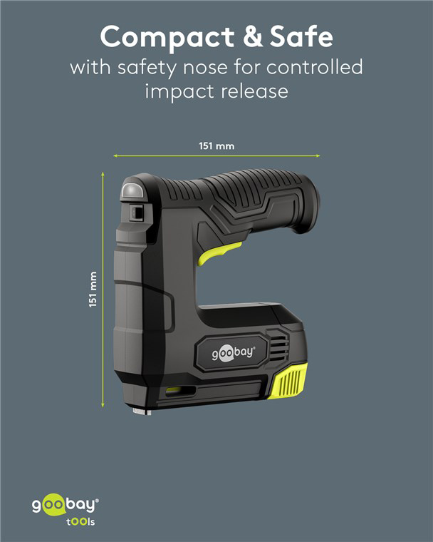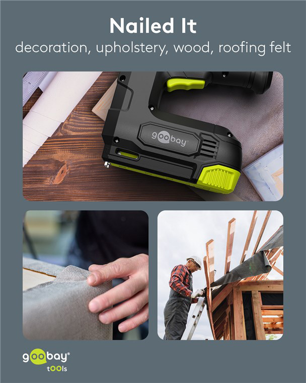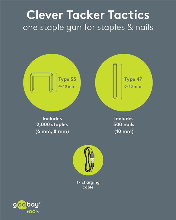 Πρακτικό και ισχυρό, ασύρματο καρφωτικό μπαταρίας της Goobay, ιδανικό για επισκευές/συναρμολογήσεις επίπλων, εργασίες ταπετσαρίας, στερέωση μονωτικών υλικών ή σοβατεπιών και DIY εφαρμογές.