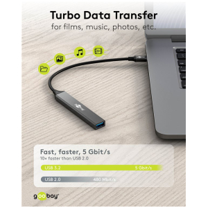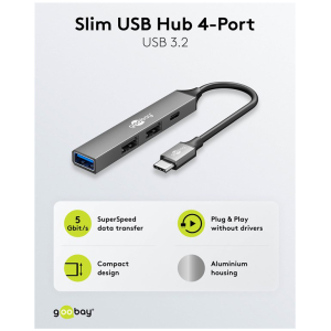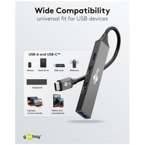 Αυτό το hub της Goobay μπορεί να συνδεθεί με το laptop ή το desktop σας μέσω θύρας USB-C και να επεκτείνει τις θύρες του με 1x USB-C και 3x USB θύρες. Διαφορετικές συσκευές USB, όπως εξωτερικοί σκληροί δίσκοι, card readers, ποντίκια κλπ. μπορούν να συνδεθούν μέσω του hub.