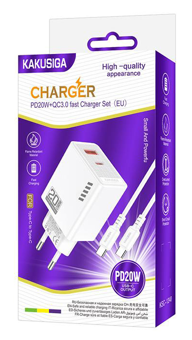 KAKUSIGA φορτιστής τοίχου KSC-1240 με καλώδιο USB-C, USB & USB-C, 20W, λευκός