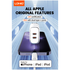 LDNIO φορτιστής τοίχου A2528M με καλώδιο, 2x USB-C, 35W, MFi, λευκό