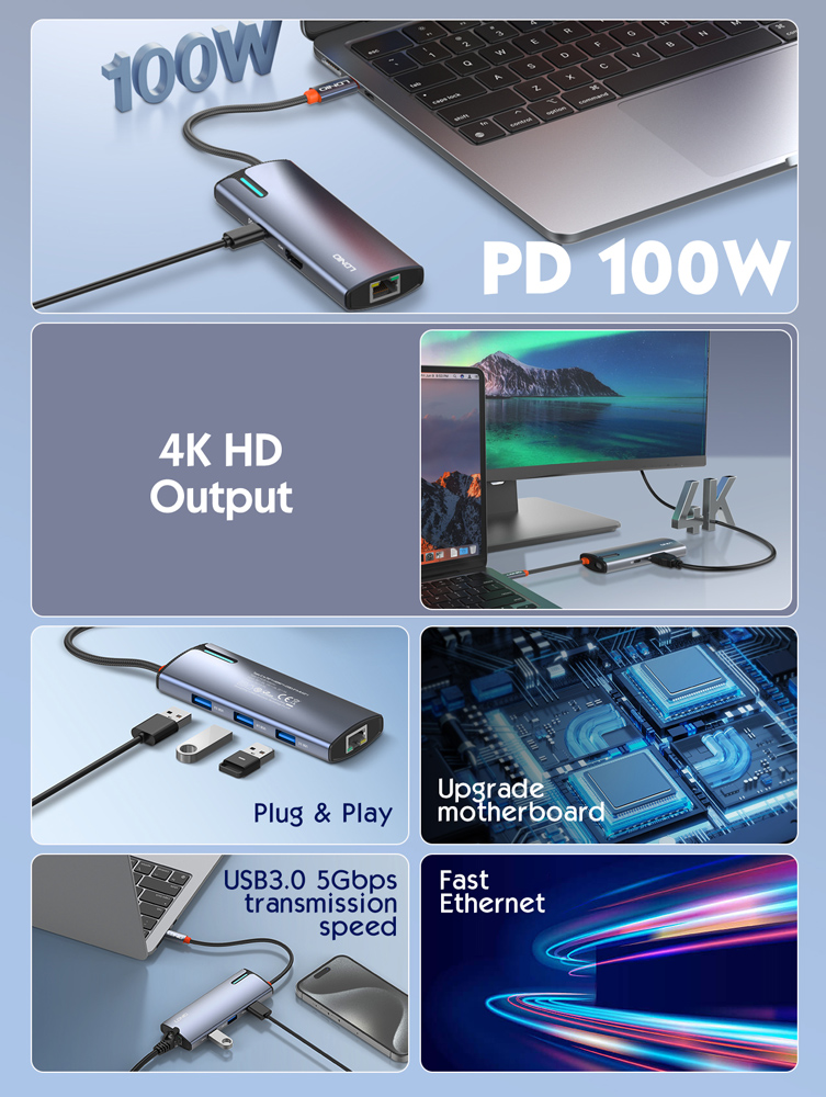 Μέσω της θύρας USB-C PD μπορείτε να φορτίσετε το laptop σας με απόδοση έως 100W ενώ μέσω της θύρας HDMI σας επιτρέπει την σύνδεση οθόνης με ανάλυση έως 4K. Επιπλέον, εξοπλίζεται με θύρα RJ45 για ενσύρματη σύνδεση στο δίκτυο με ταχύτητες έως 1000Mbps.