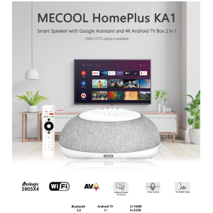 Το HomePlus KA1 από την Mecool είναι μια έξυπνη συσκευή που λειτουργεί ως TV Box, αποκωδικοποιητής και smart ηχείο, ενώ χάρη στα 2 ενσωματωμένα μικρόφωνα, υποστηρίζει τον έλεγχο των smart συσκευών σας μέσω φωνητικών εντολών.