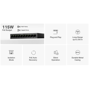 8x θύρες PoE+ 10/100 Mbps + 2x θύρες Gigabit