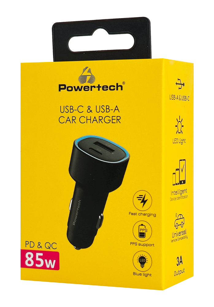 Υψηλής απόδοσης φορτιστής αυτοκινήτου της Powertech, συμβατός με συσκευές που φορτίζουν μέσω θύρας USB. Διαθέτει USB και USB-C θύρες εξόδου που υποστηρίζουν φόρτιση με μέγιστη συνολική απόδοση 85W.