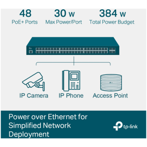 PoE+ Ports(RJ45): Standard: 802.3at/af compliant, PoE+ Ports: 48 Ports, up to 30 W per port, Power Budget: 384 W