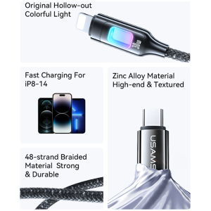 Καλώδιο φόρτισης και μεταφοράς δεδομένων Lightning σε USB-C της Usams. Υποστηρίζει φόρτιση με απόδοση έως 30W και μεταφορά δεδομένων με ταχύτητα έως 480Mbps.