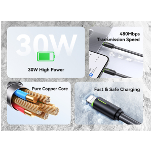 Καλώδιο φόρτισης και μεταφοράς δεδομένων Lightning σε USB-C της Usams. Υποστηρίζει φόρτιση με απόδοση έως 30W και μεταφορά δεδομένων με ταχύτητα έως 480Mbps.