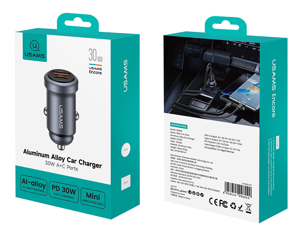 USAMS φορτιστής αυτοκινήτου CC322, USB & USB-C, 30W, γκρι