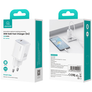 Υψηλής απόδοσης φορτιστής τοίχου της Usams, κατασκευασμένος από ανθεκτικό υλικό και συμβατός με συσκευές που φορτίζουν μέσω θύρας USB-C.