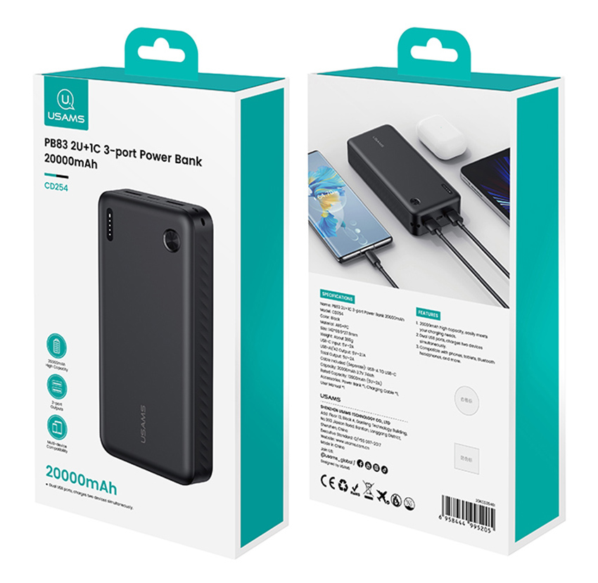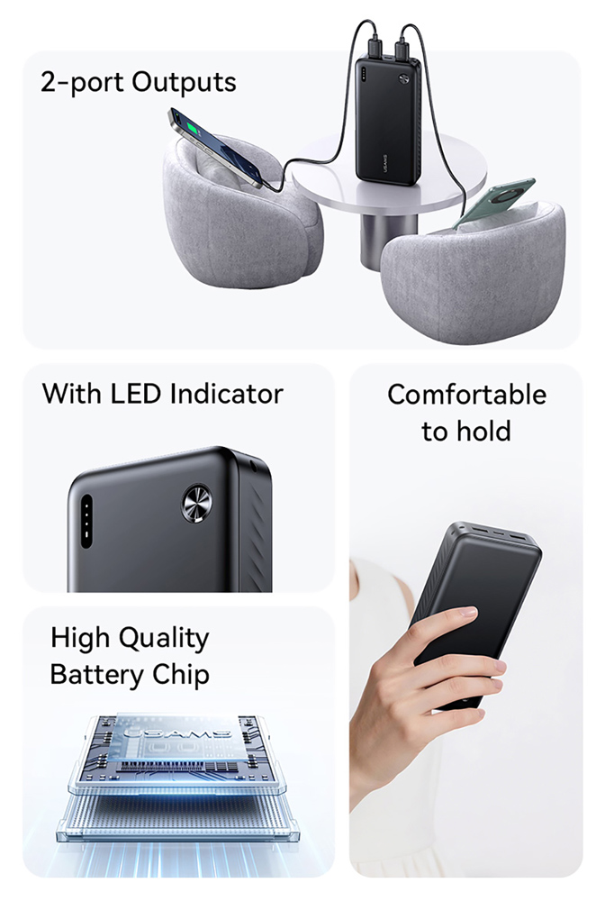 Με το power bank της Usams η χαμηλή στάθμη της μπαταρίας δεν θα αποτελεί άλλο πρόβλημα, καθώς σας επιτρέπει να φορτίσετε smartphone, tablet, ακουστικά και άλλες φορητές συσκευές οπού και αν βρίσκεστε.