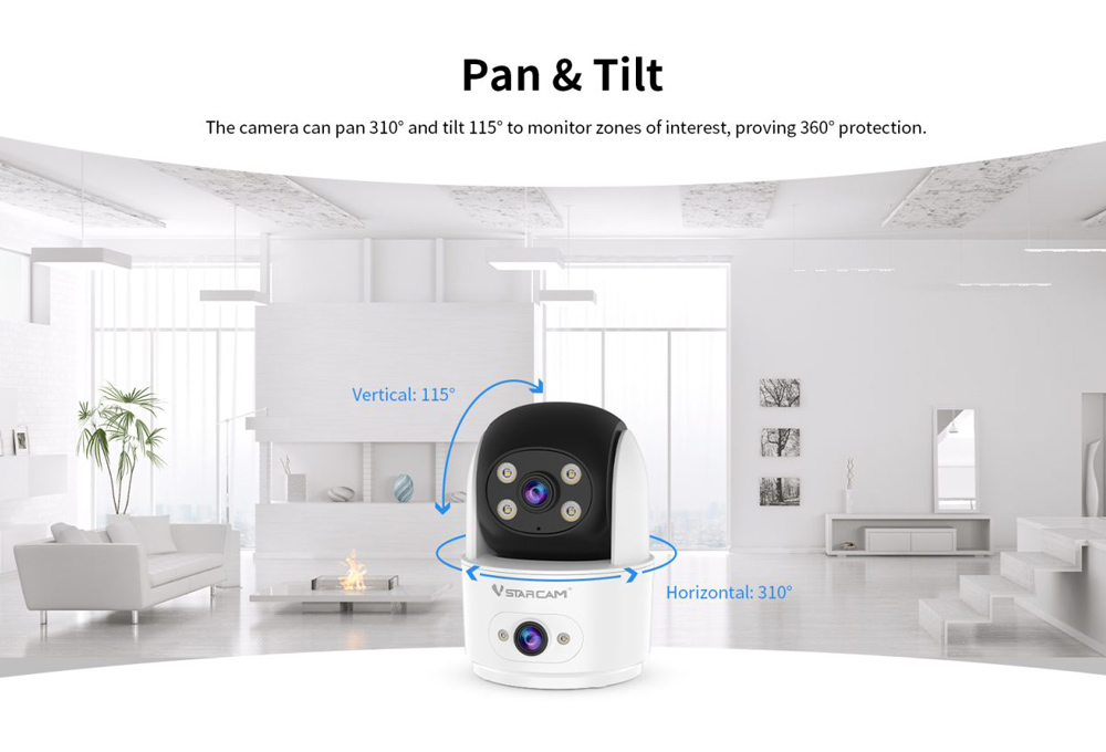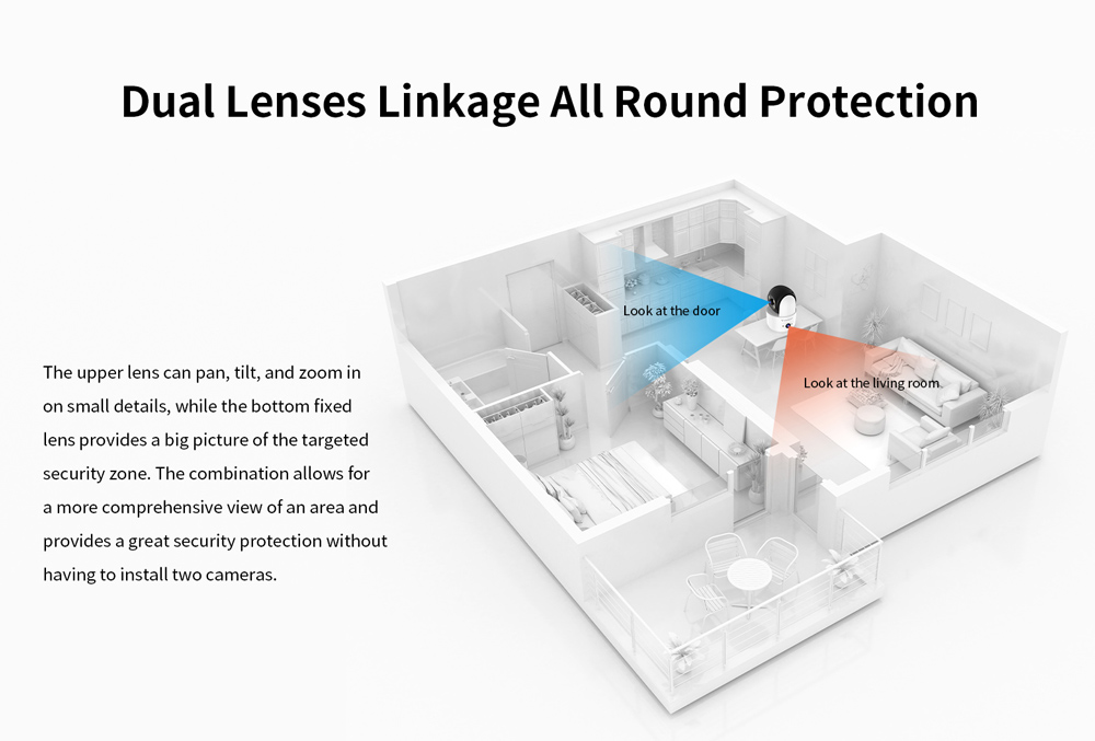Ενσωματώνει 2 φακούς για μεγαλύτερη κάλυψη στον χώρο και υποστηρίζει PTZ λειτουργία που σας επιτρέπει την οριζόντια και κάθετη μετακίνηση της κάμερας μέσω της εφαρμογής, για την εύκολη προσαρμογή της στην ιδανική γωνία.
